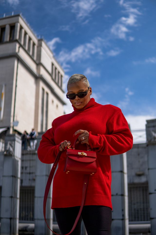 Whereas in Belgium, she opted for an outsized crimson turtleneck sweater, that she paired with black jeggings, and the ‘Traditional New Yorker bag’ in soho crimson from Silver & Riley.